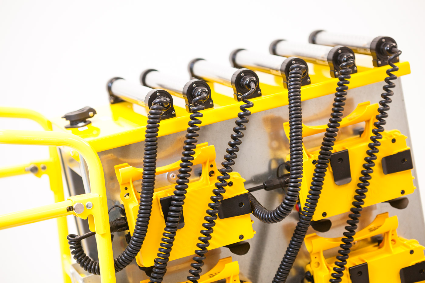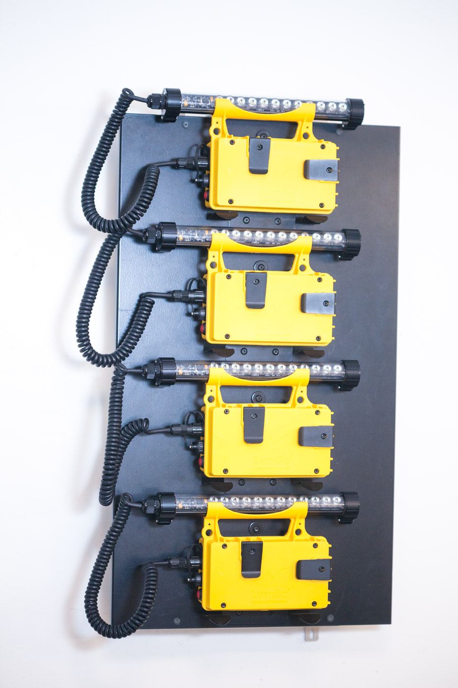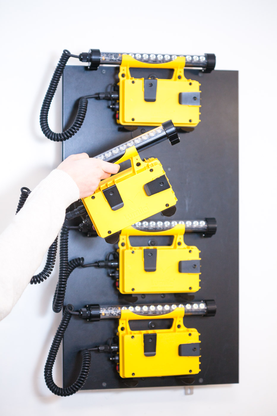 La station de charge murale permet le rangement simple et la charge par induction de 4 LumiPack en simultané. En une action, rangez et chargez vos LumiPack® ! Profitez ainsi d’un éclairage disponible et chargé pour vos opérations de maintenance.