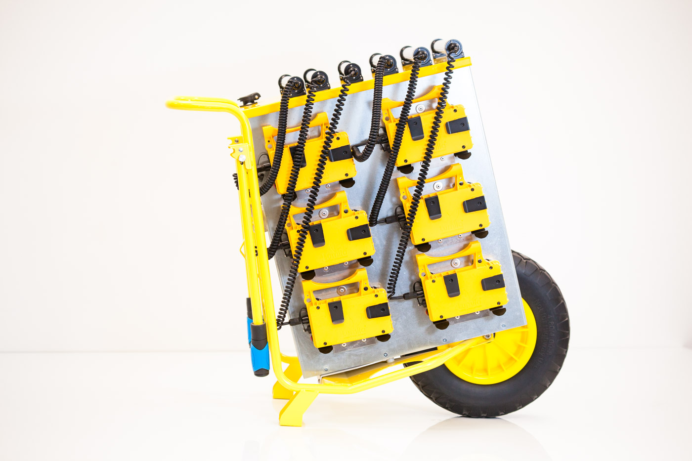 La station de charge mobile permet le rangement et la charge par induction de 12 LumiPack en simultané. Grâce à sa roue de grand diamètre, cette station peut être acheminée au plus près de vos chantiers sur tous types de terrains.