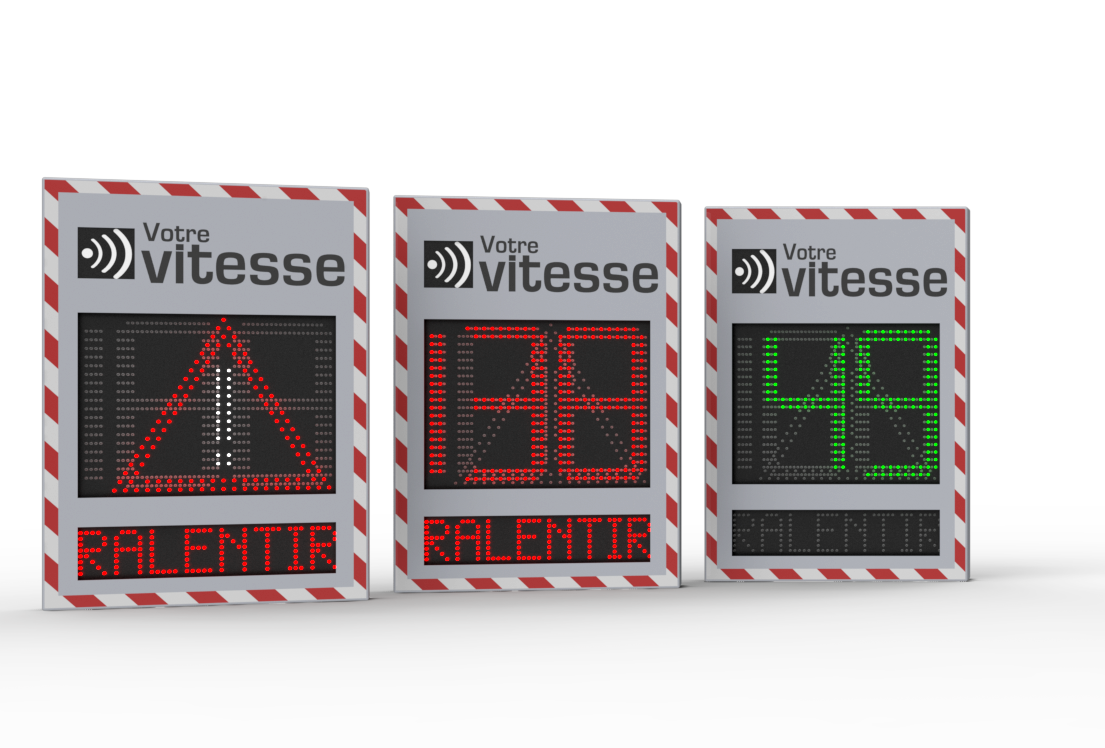 En complément, un message d’alerte “RALENTIR” s’affiche automatiquement lorsque le seuil réglementaire est dépassé. Le pictogramme A14 (⚠️) peut également être alterné avec l’affichage des vitesses excessives, renforçant ainsi l’impact visuel et la sensibilisation des conducteurs.