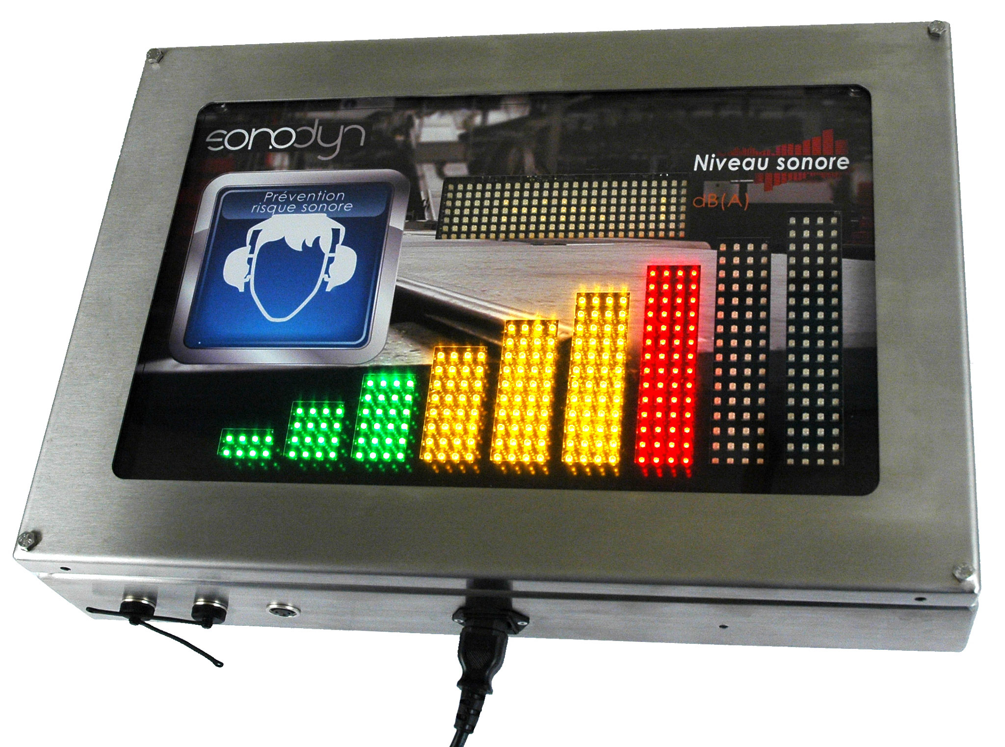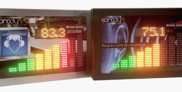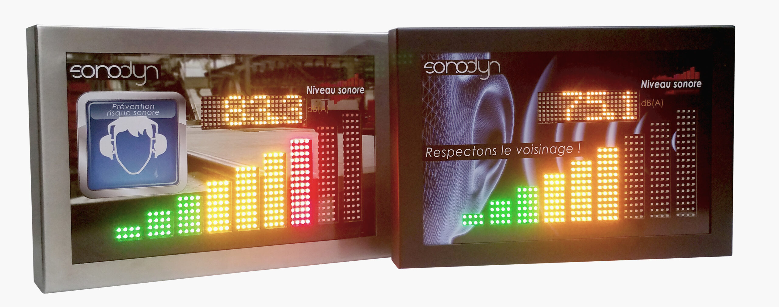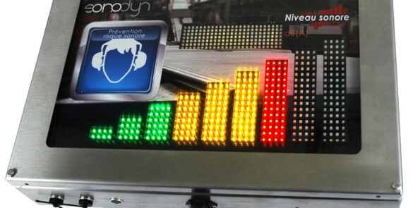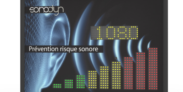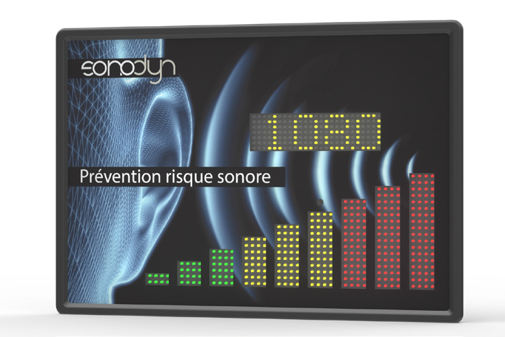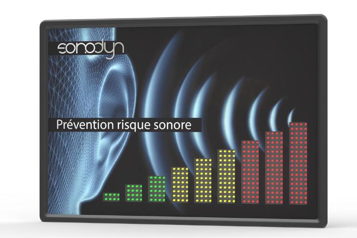 SONODYN© est un outil préventif simple qui mesure le niveau sonore d’un environnement (atelier de travail, salle de spectacle, cantines, etc.) et l’indique clairement grâce à son affichage digital (en décibels), associé à un graphe variant du vert au rouge, en passant par l’ambre, selon l’intensité des sons enregistrés.